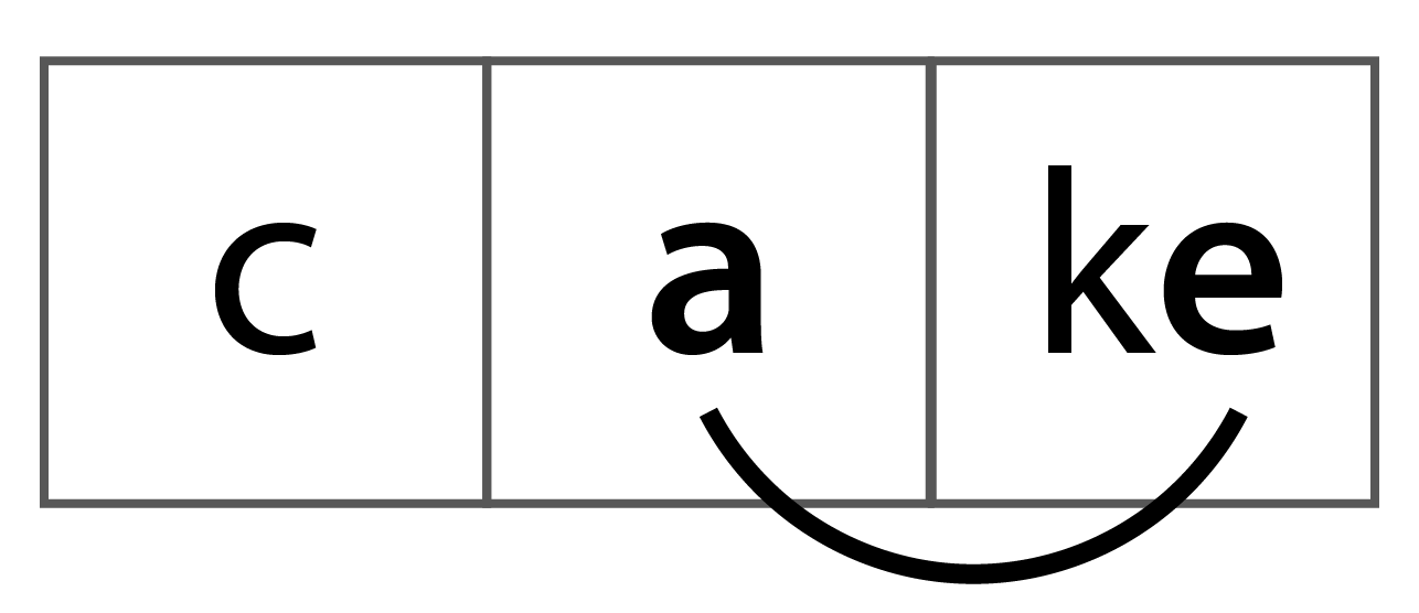 When we segment a word with a split digraph, we show the split digraph using a curved line to show the connection between the two letters. For example the sound /ai/ in cake is represented like this.