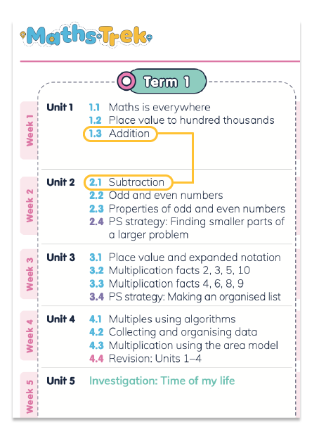 In Unit 1.3 (as highlighted below), students learn about addition and are explicitly taught how to add three-digit numbers with regrouping. This is immediately followed by its related operation, subtraction, in Unit 2.1. These skills are further practised in subsequent topics until they are revised a few weeks later in the revision unit. This is quickly followed by applying the concept to real-world contexts in the investigation and then finally assessed.