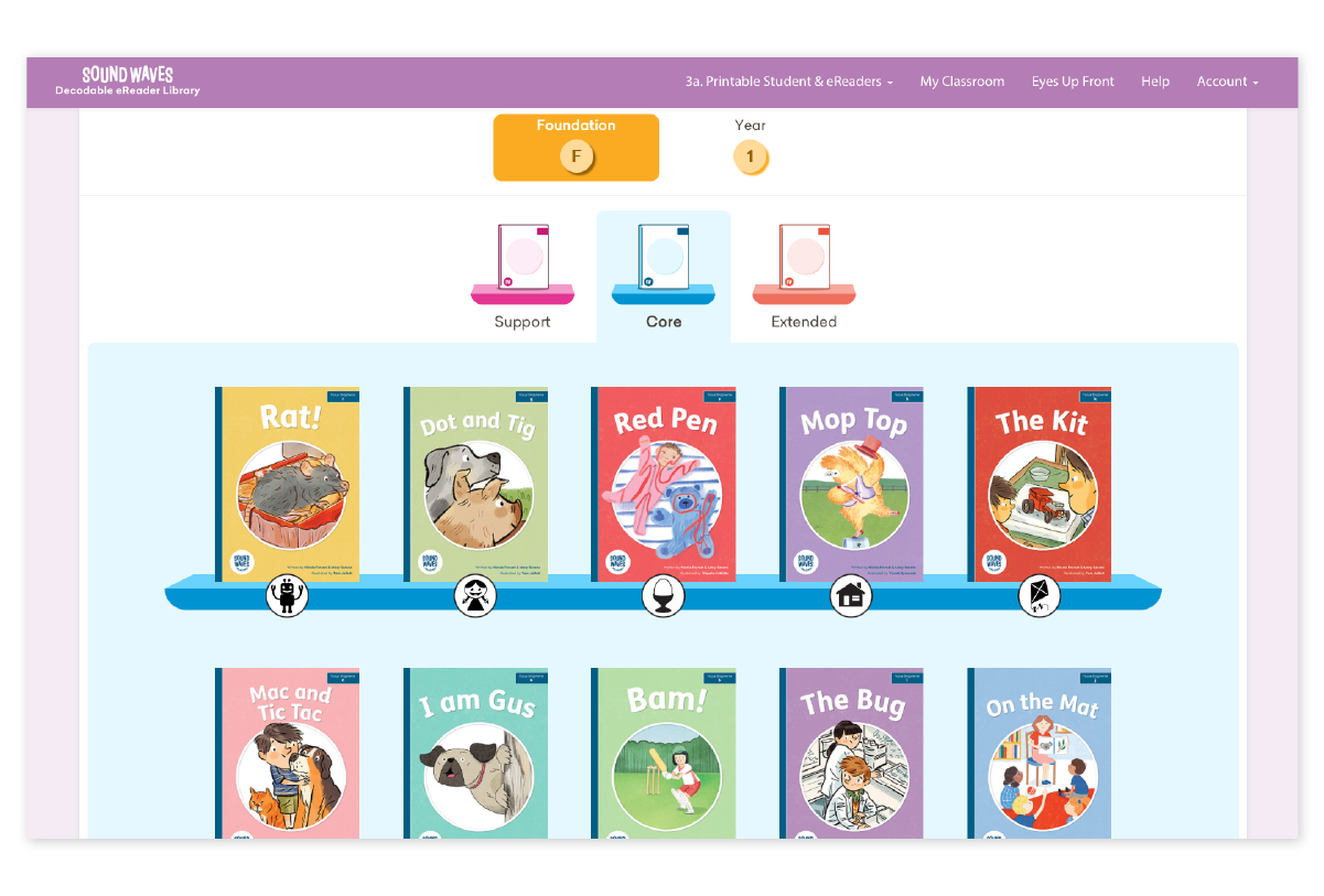 The Sound Waves Decodable eReader Library is our newest feature, providing students with access to our entire range of decodable readers. The eLibrary includes all Support, Core and Extended books from Foundation and Year 1 – that’s 266 books in total!.